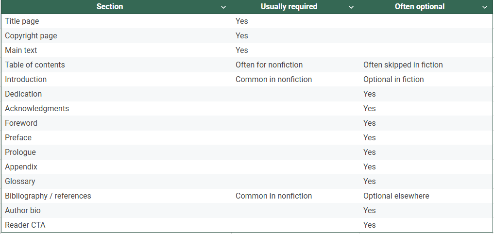 The standard guidance from publishing platforms and book-production tools is consistent on this point: some elements are foundational, while many others are optional and should be chosen based on the type of book and the needs of the reader.